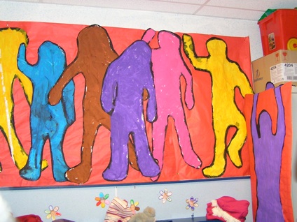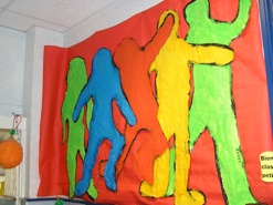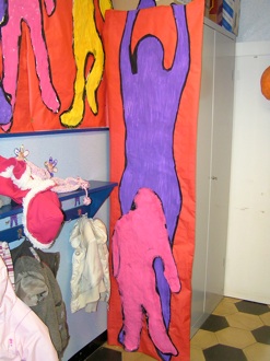Les silhouettes ont été collées sur une nappe rouge et affichées au mur du couloir.